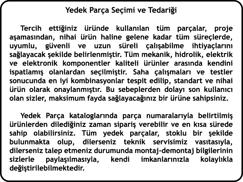 Ürününüz ile teslim edilen Yedek Parça Kataloğunu kesinlikle muhafaza ediniz. İhtiyaç duyulması halinde bu katalogdan gerekli ürünü kodu ile talep edebilirsiniz.